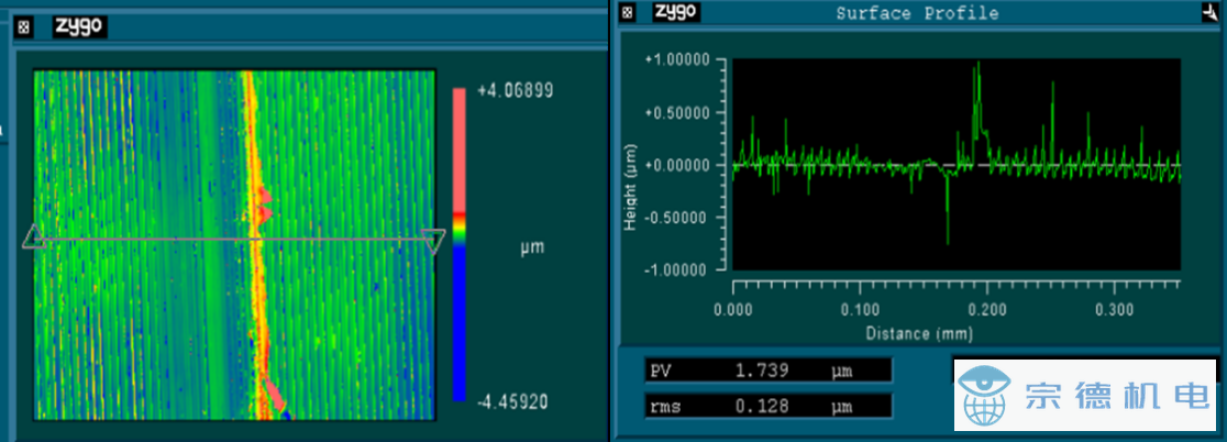 商用的球盤摩擦試驗(yàn)機(jī)均需要長時(shí)間的磨合過程,在摩擦過程達(dá)到穩(wěn)態(tài)之前,摩擦副已經(jīng)發(fā)生了嚴(yán)重的磨損,表面形貌發(fā)生了極大程度的改變,因此不能用于研究特定表面形貌(特定表面粗糙度、表面微織構(gòu)等)的摩擦試驗(yàn),本超高速球-盤摩擦試驗(yàn)機(jī)由于降低了摩擦盤的端面跳動,可以極大程度的降低磨合過程,實(shí)現(xiàn)近無磨損的摩擦學(xué)測試,因此可以用于特定表面的摩擦學(xué)測試。無氧銅與單晶金剛石組成的摩擦副摩擦后無氧銅的表面形貌如圖7所示。