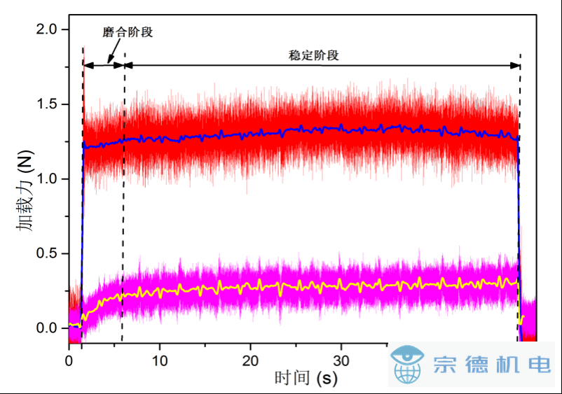 由于極大程度的降低了摩擦盤的端面跳動,相對于商用球-盤摩擦試驗(yàn)機(jī)而言,可以將摩擦?xí)r間急劇減小,同時(shí)提高摩擦過程的穩(wěn)定性,典型的摩擦力和加載力原始力信號如圖4所示。