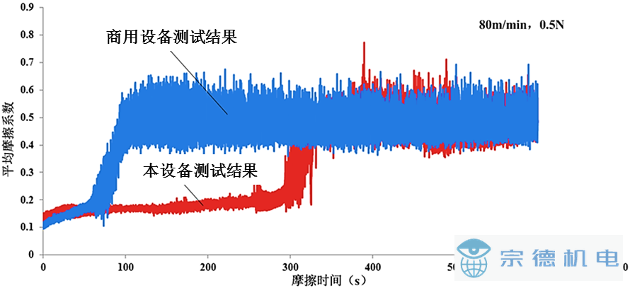 商用的球-盤摩擦試驗(yàn)用于摩擦盤端面跳動較為嚴(yán)重,在摩擦進(jìn)入穩(wěn)態(tài)前需要較長時(shí)間的摩擦過程。而一般的涂層材料較薄,在未進(jìn)入穩(wěn)態(tài)前涂層已經(jīng)發(fā)生了嚴(yán)重磨損,導(dǎo)致測得的結(jié)果是涂層基體材料與另一個對磨體的摩擦系數(shù)而非涂層本身與另一個對磨體的摩擦系數(shù),因此無法實(shí)現(xiàn)超薄涂層的摩擦測試。本超高速摩擦試驗(yàn)機(jī)由于降低了摩擦盤的端面跳動,可以大幅度的降低磨合過程,減小涂層的磨損,因此可以實(shí)現(xiàn)超薄涂層的摩擦試驗(yàn)。