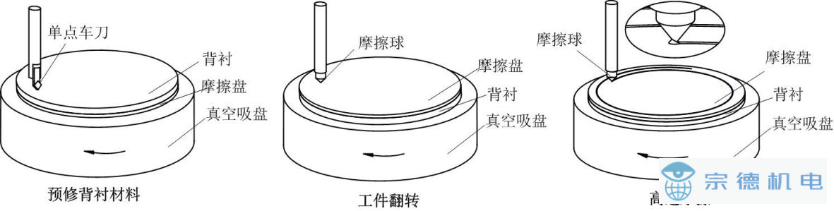 平臺主要包括: 鑄鐵床身、內(nèi)藏式動靜壓電主軸、高精度直線運(yùn)動模組(水平方向和垂直方向)、原位動平衡系統(tǒng)、精密壓電式測力儀等, 如圖1所示。試驗(yàn)前對摩擦盤及主軸系統(tǒng)進(jìn)行原位動平衡,大幅度降低主軸-摩擦盤系統(tǒng)在高速旋轉(zhuǎn)條件下的振動,增加測試的穩(wěn)定性。對于易切削加工材料,在試驗(yàn)前對摩擦盤進(jìn)行在線超精密車削,極大程度的降低摩擦盤端面的跳動,如圖2所示。對于難切削加工材料,通過增加背襯材料,輔助以互為基準(zhǔn)超精密原位車削,降低摩擦盤的端面跳動,如圖3所示。